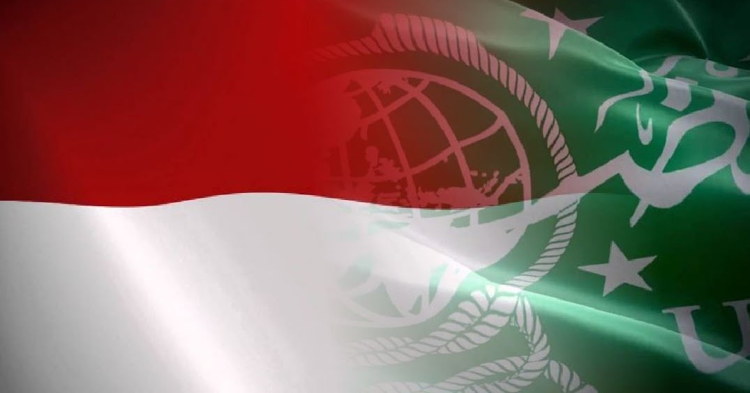 Tulisan nahdlatul ulama dalam huruf arab melintang di tengah bumi untuk menunjukkan nama organisasi tersebut, nahdlatul ulama, kebangkitan para ulama.