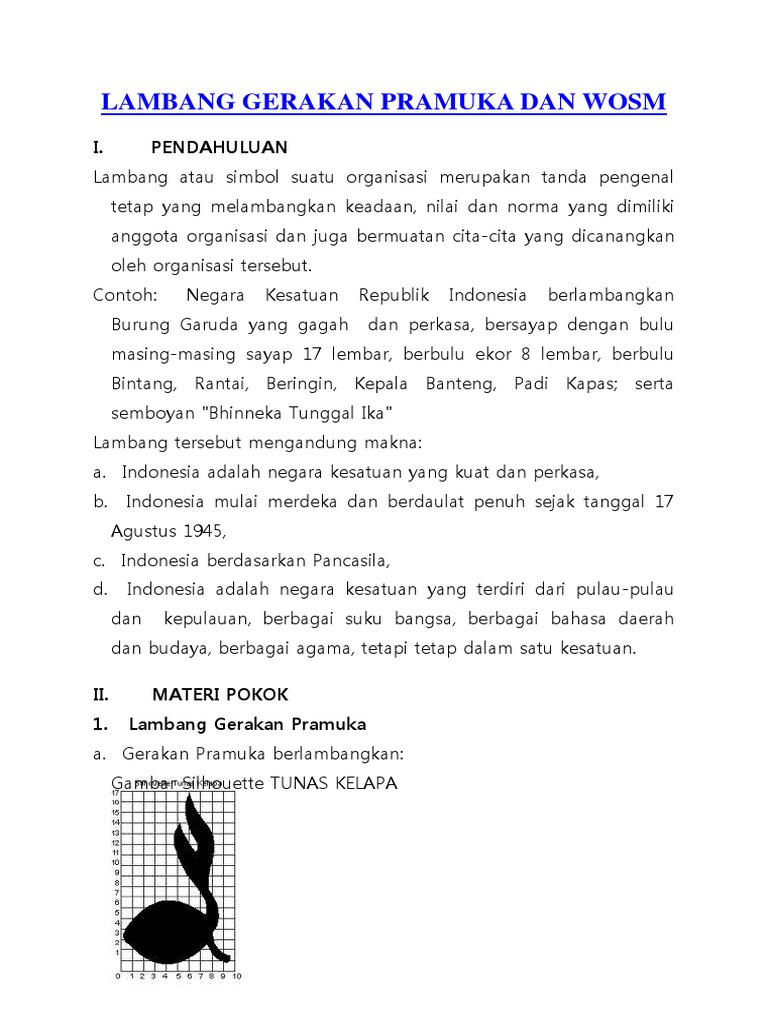 Lambang pramuka berbentuk bayangan (silhouette) dari tunas kelapa. Lambang ini diciptakan oleh soenardjo atmodipoerwo, seorang pegawai tinggi departemen pertanian yang juga tokoh pramuka. Adapun penjelasan tentang arti lambang pramuka ini telah ditetapkan dalam suatu keputusan kwarnas nomer 06/kn/72 tentang arti lambang pramuka yang telah mendapatkan hak paten. Ini mengandung arti, pramuka adalah inti bagi kelangsungan hidup bangsa (tunas penerus bangsa).